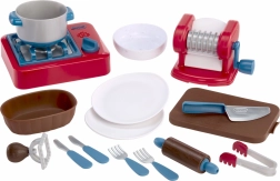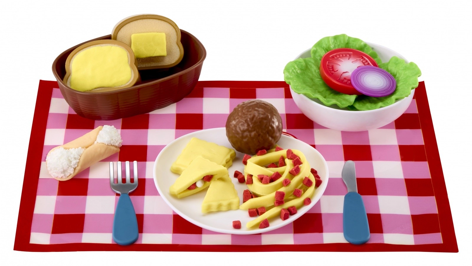Casseroles, poêle, assiettes, couverts, planche à découper, rouleau et aliments en plastique (pain, œufs, feuilles de salade, tomate, oignon, beurre, boulettes de viande, cannoli) pour une table complète.