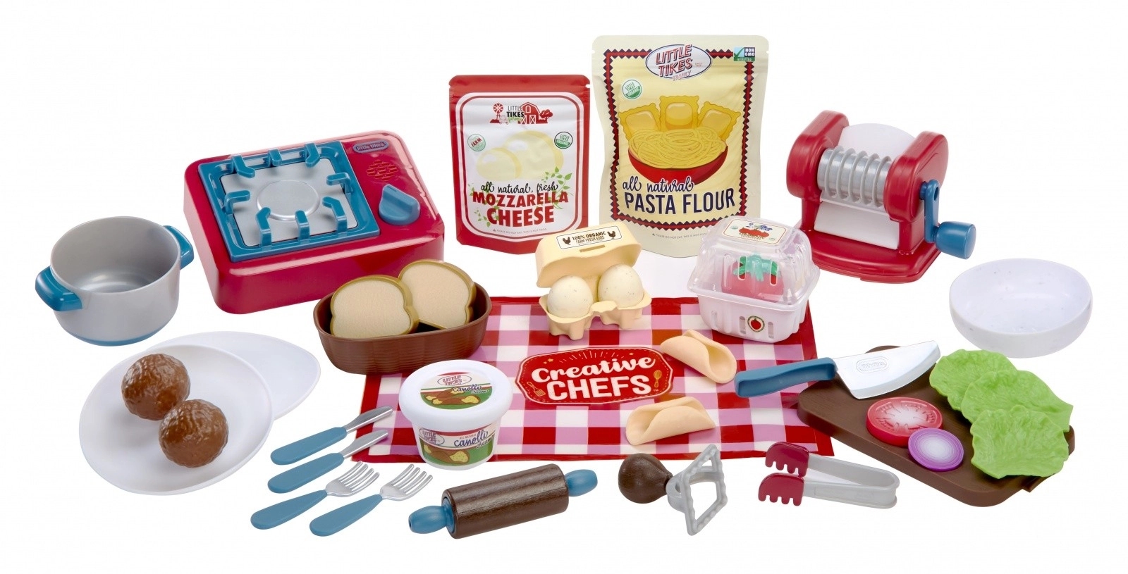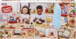 Un extrudeur de pâtes fonctionnel et des accessoires permettent aux enfants de presser différentes formes de “nouilles” et de raviolis, d’abaisser la “pâte” et de préparer un authentique festin italien.