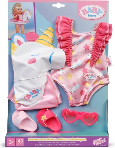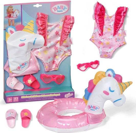 Avec cet ensemble enchanteur, la poupée BABY born devient la vedette de chaque baignade. Le maillot rose à volants et motif licorne apporte du charme, tandis que la bouée gonflable en forme de licorne assure une “nage” amusante. Le style est complété par des sandales roses ornées d’étoiles et des lunettes de soleil en forme de cœur.
