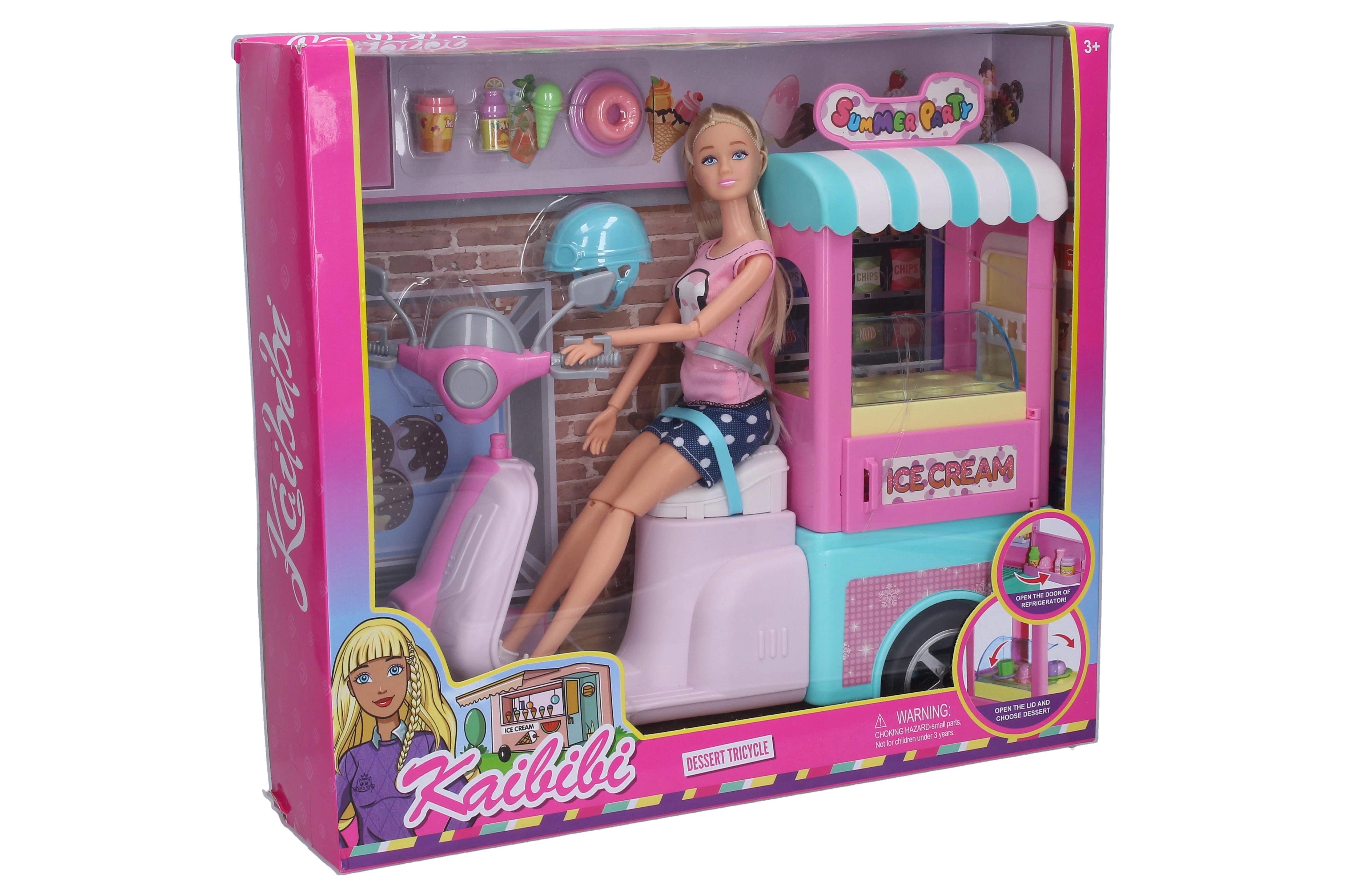 - Set complet: poupée, scooter de glacier, casque et accessoires thématiques.