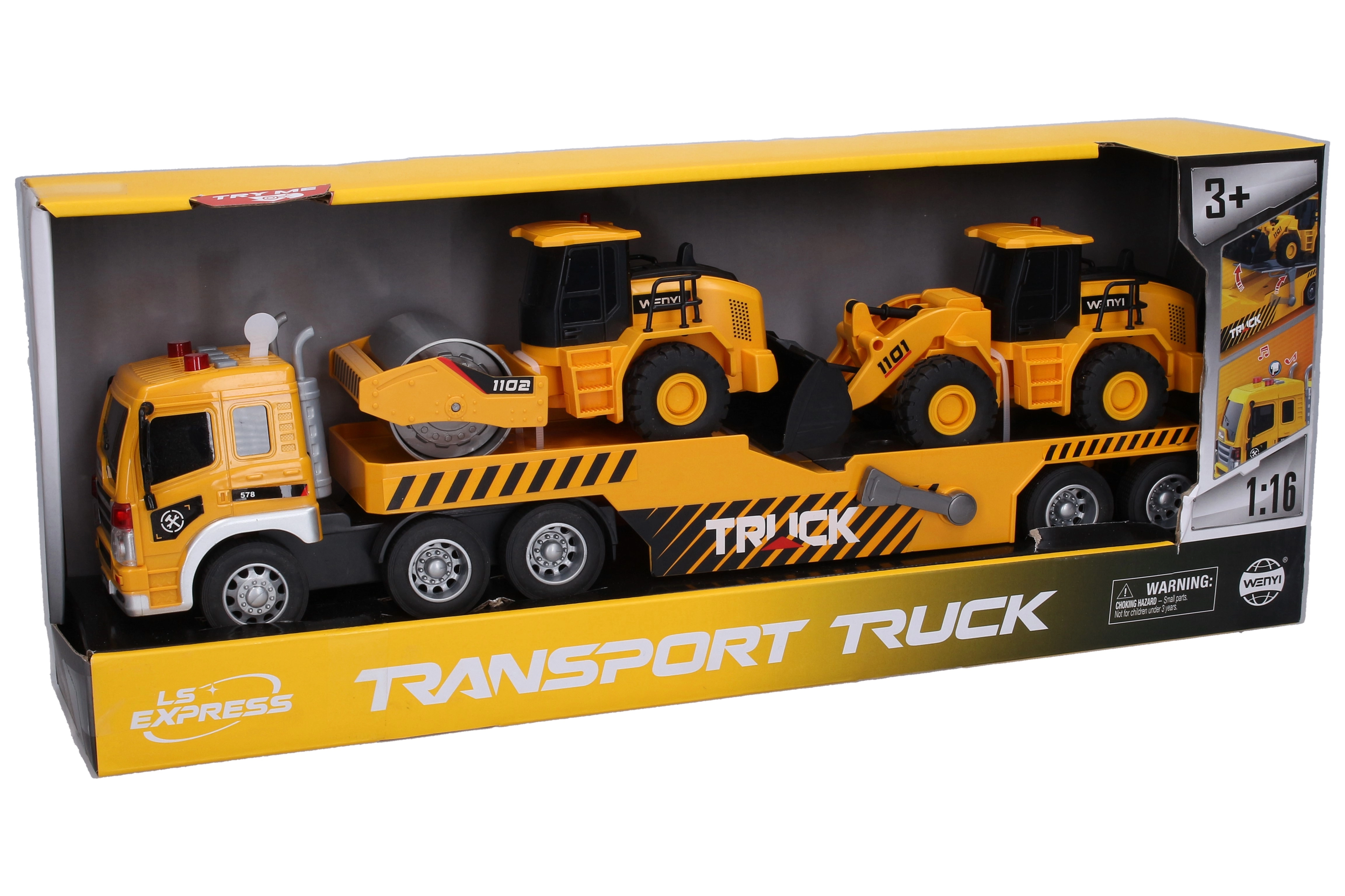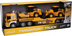 Profitez d’un jeu réaliste avec un set combinant un grand tracteur routier avec remorque et deux engins de chantier – un rouleau compresseur et un chargeur. Le camion est équipé de sons de moteur, marche arrière, klaxon et d’un effet de basculement de la plateforme. Grâce au mécanisme à inertie, le camion démarre facilement et roule naturellement.