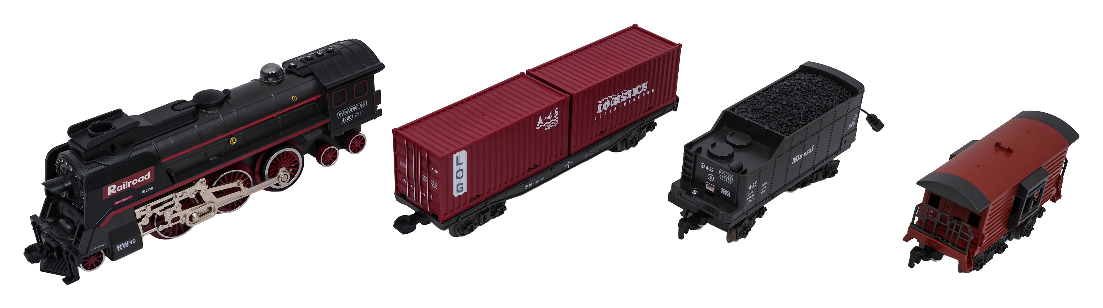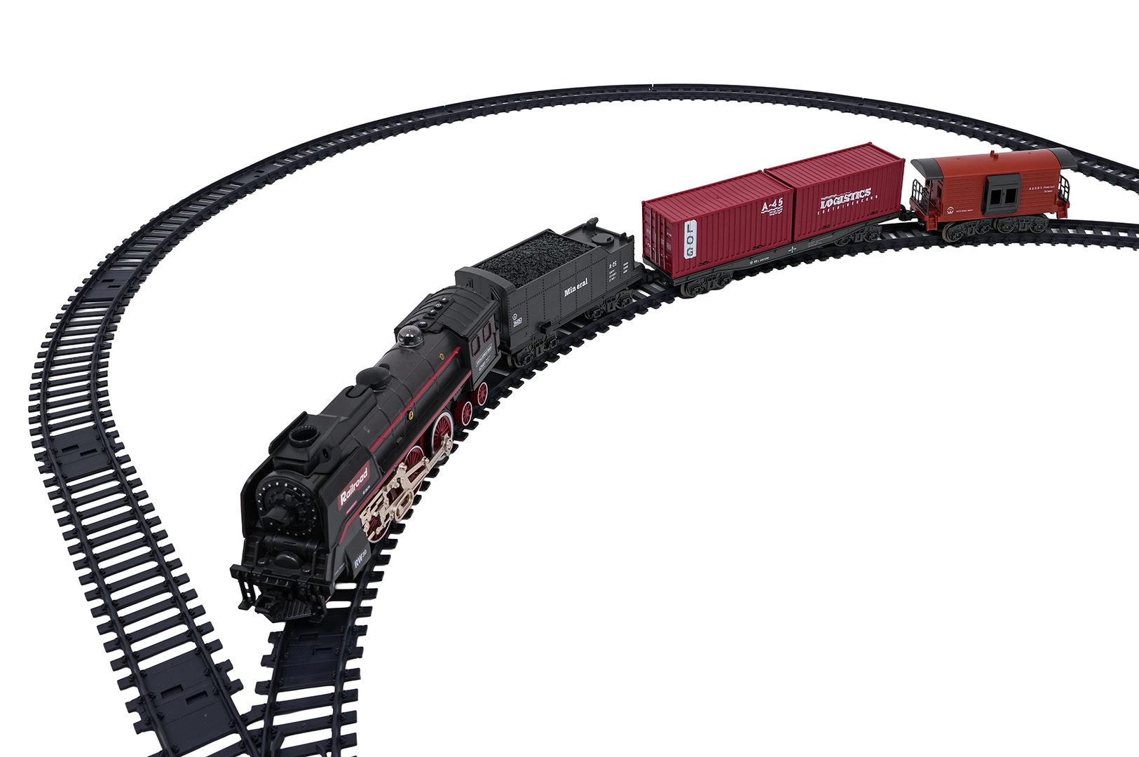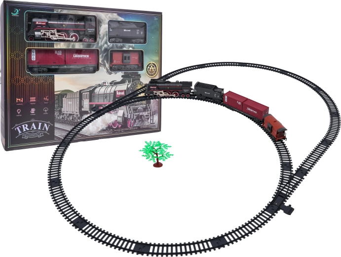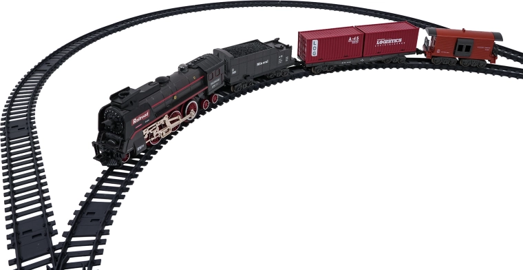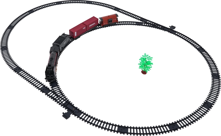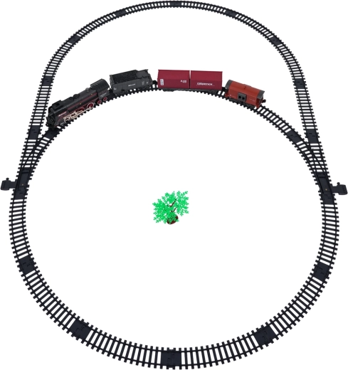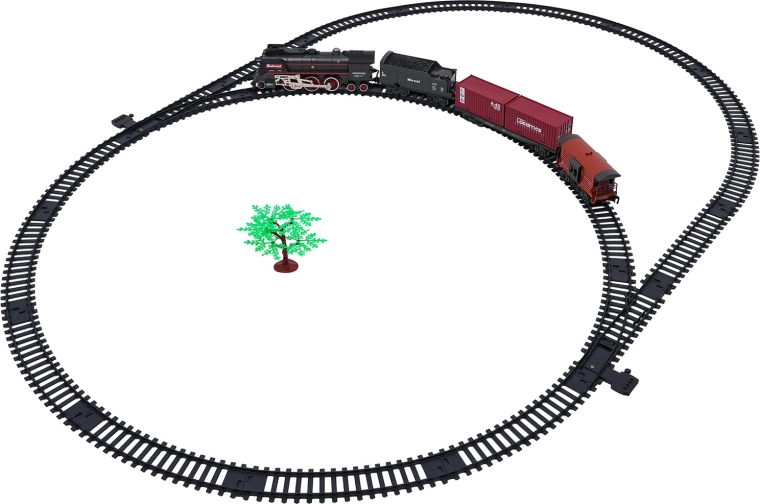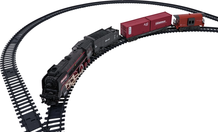 Les rails sont résistants, sûrs et se connectent facilement pour former un circuit d’environ 138 × 99 cm. Sont inclus une voiture voyageurs, un tender à charbon et un wagon porte-conteneurs pour multiplier les scénarios de jeu. Pour un fonctionnement plus calme, il est possible de désactiver les sons; la locomotive gère la marche avant, arrière et l’arrêt.