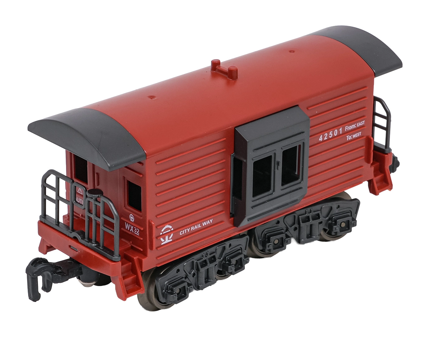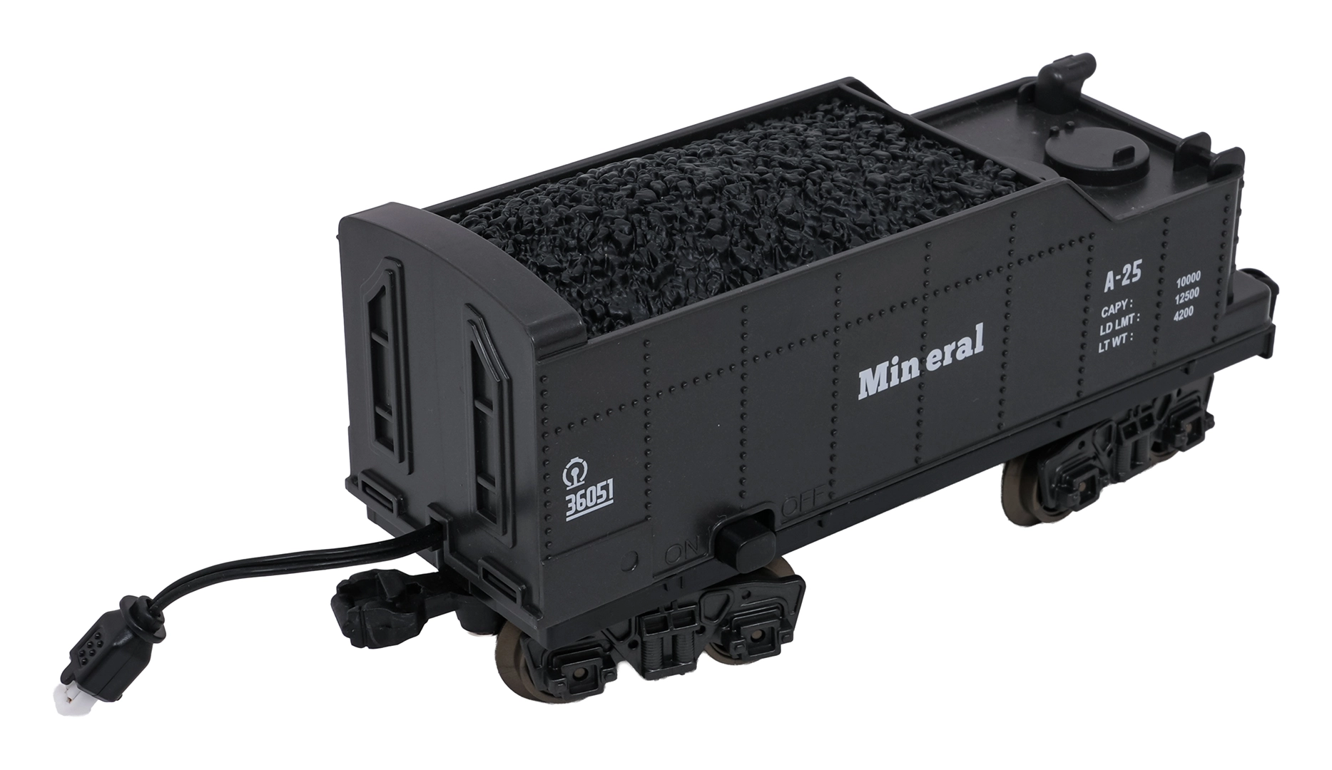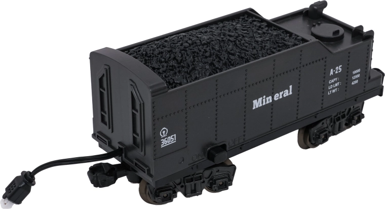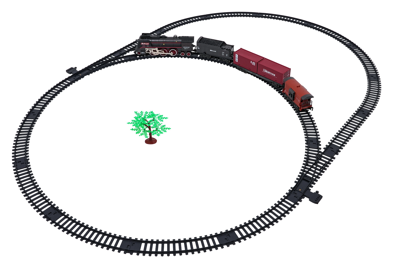Les rails sont résistants, sûrs et se connectent facilement pour former un circuit d’environ 138 × 99 cm. Sont inclus une voiture voyageurs, un tender à charbon et un wagon porte-conteneurs pour multiplier les scénarios de jeu. Pour un fonctionnement plus calme, il est possible de désactiver les sons; la locomotive gère la marche avant, arrière et l’arrêt.