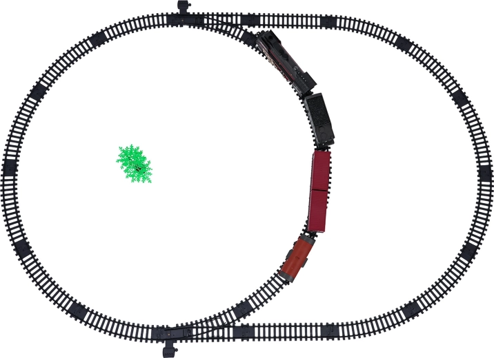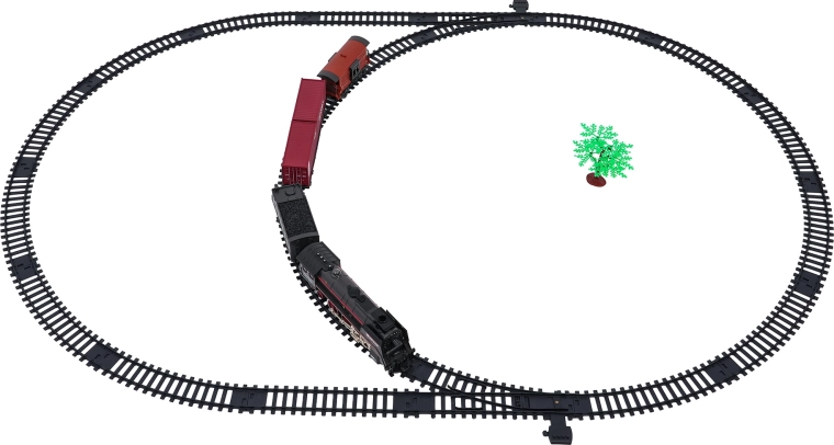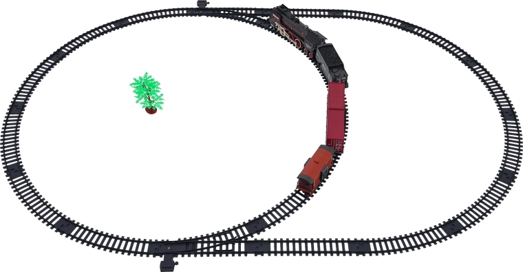 Des rails en plastique robustes avec un système d’emboîtement simple permettent de construire rapidement un ovale, un huit ou une double boucle selon l’espace et l’imagination.