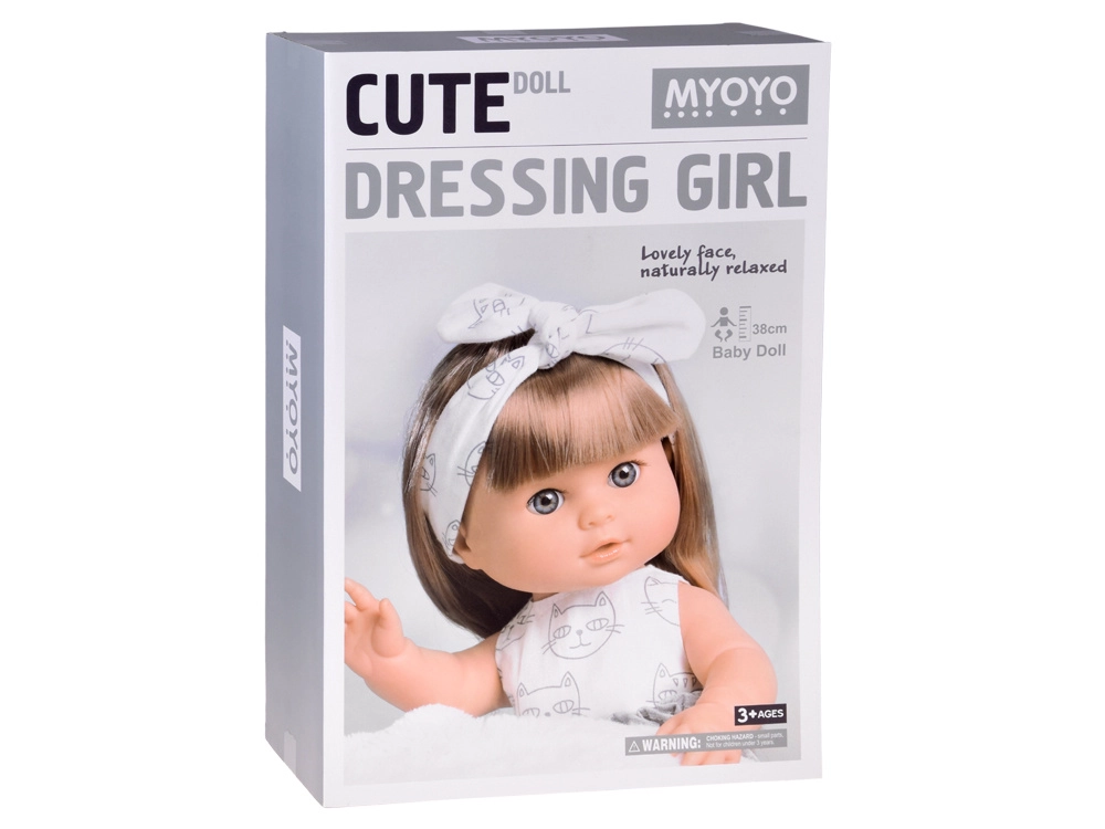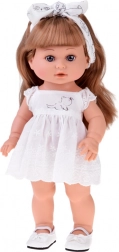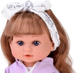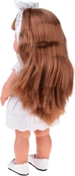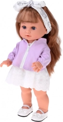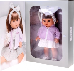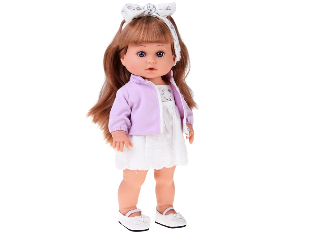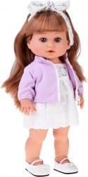 Découvrez une adorable poupée aux longs cheveux de 38 cm qui ravira les petites coiffeuses et les passionnés de mode. Elle possède des traits réalistes, de longs cheveux bruns à coiffer, des membres articulés et porte une robe blanche en dentelle avec une petite veste lilas. Un peigne est inclus pour des coiffures infinies et un jeu créatif.