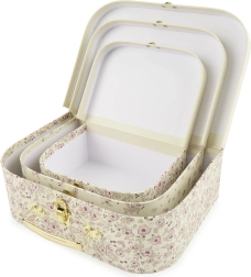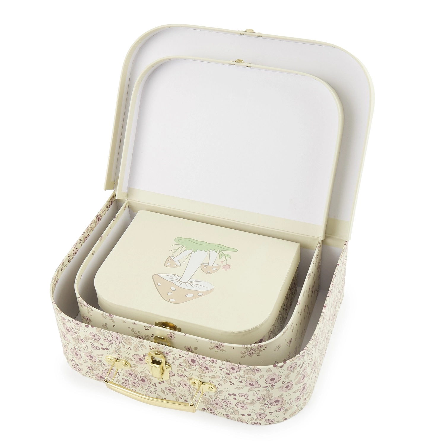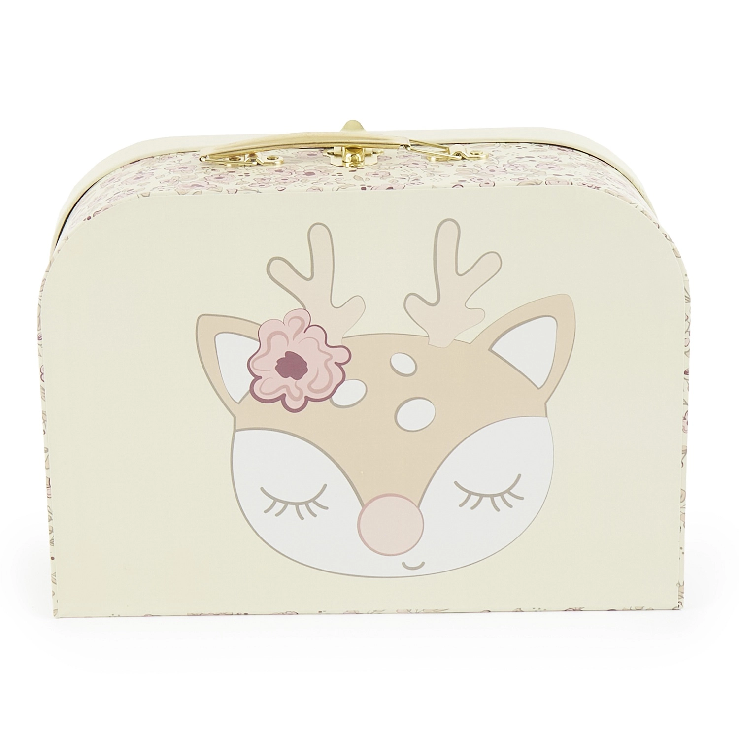 Un set stylé de trois valisettes en carton illumine la chambre d’enfant comme les voyages. Il combine un adorable motif de faon Ella, un imprimé floral vintage, une fermoir métallique solide et une poignée confortable. Grâce au design emboîtable (nesting), les valisettes sont compactes, légères et idéales pour ranger trésors, jouets et petites affaires.