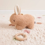 Le lapin est fabriqué en peluche polyester douce, se tient bien dans les petites mains et s’entretient facilement. Grâce à la boucle textile, vous fixez le jouet rapidement et en toute sécurité sur le lit, la poussette ou le siège auto. L’anneau en bois sert à remonter le mécanisme et fait aussi office de poignée facilement préhensible pour les petits doigts.