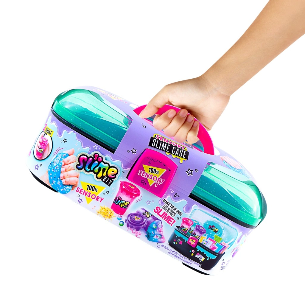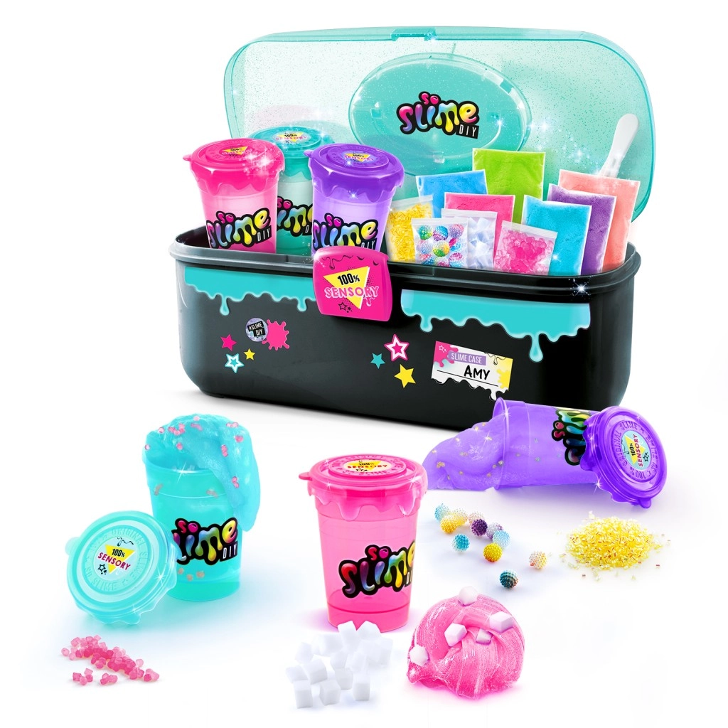 La valisette compacte SO SLIME contient tout ce dont les enfants ont besoin pour réaliser immédiatement des slimes colorés et scintillants. En quelques étapes simples, ils créent des combinaisons originales de couleurs et de textures et peuvent les décorer avec les accessoires fournis.