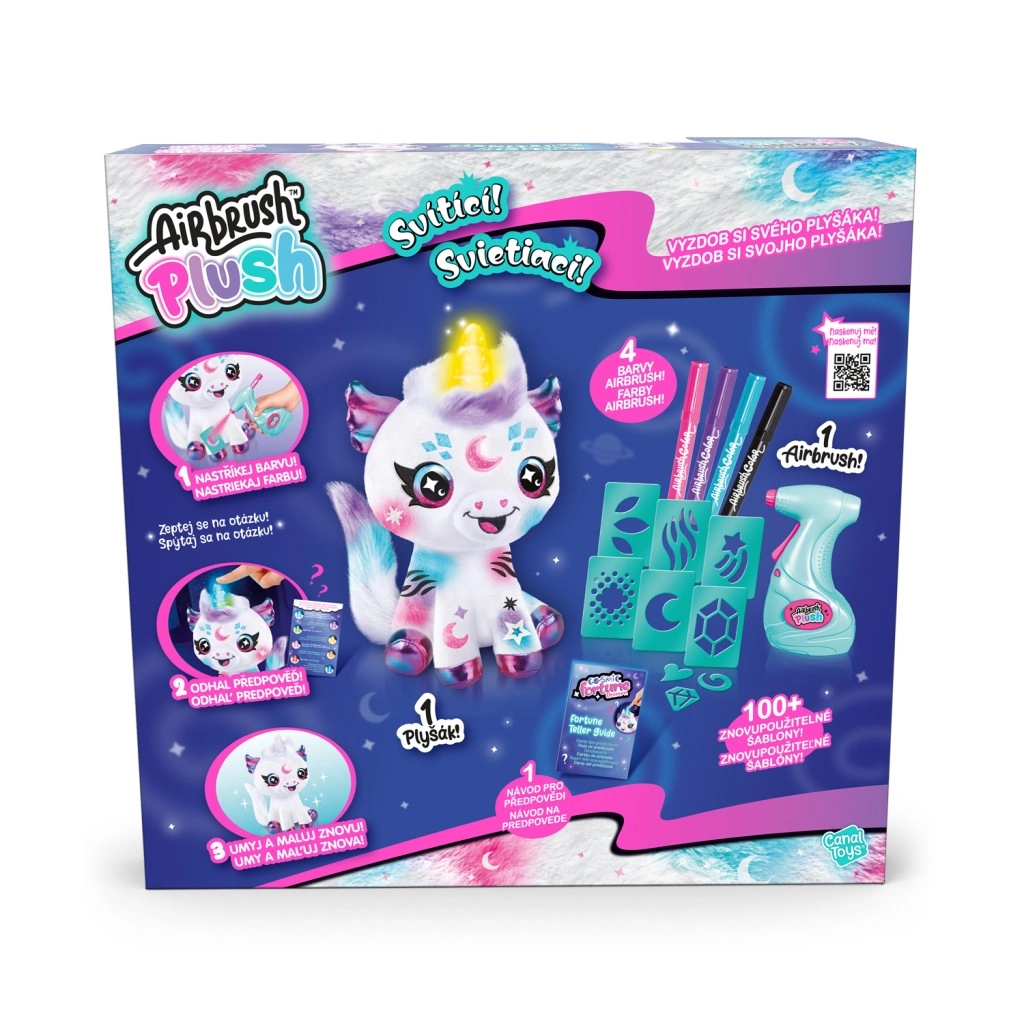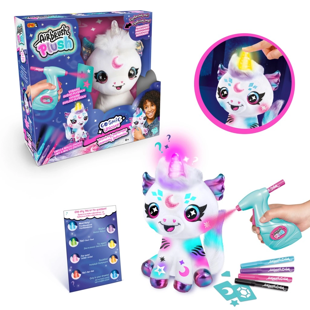 Découvre la magie de la création avec le set unique Airbrush studio – licorne cosmique. L’ensemble contient une peluche, un outil d’aérographe, 4 recharges de couleur et 100 pochoirs pour des combinaisons de motifs infinies. Des couleurs faciles à laver permettent de créer encore et encore, tandis que la corne magique lumineuse ajoute un jeu interactif avec des réponses oui/non. Un cadeau créatif idéal pour les enfants dès 6 ans.