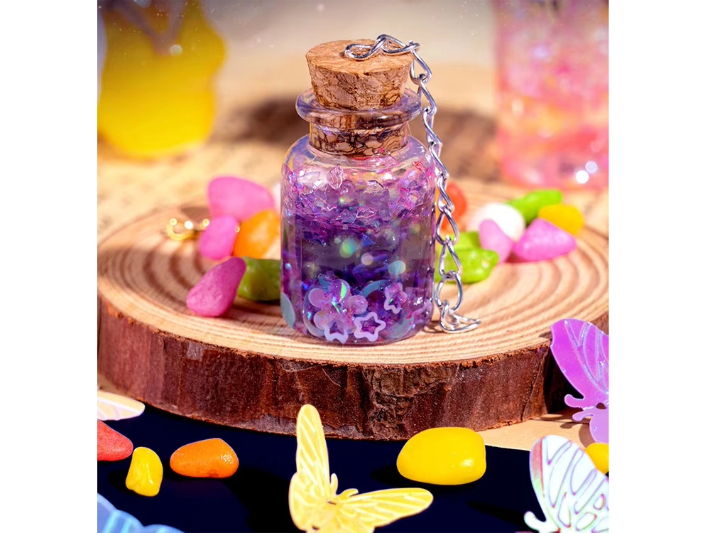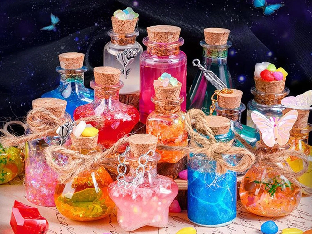 Le kit de fabrication « d’élixirs magiques » transforme chaque idée en une mini œuvre scintillante. Il suffit de verser les paillettes et décors dans la fiole, d’ajouter de l’eau avec du pigment, de fermer avec le liège et d’agrémenter de pendentifs. Le résultat peut être un pendentif, un talisman ou une adorable décoration de chambre.