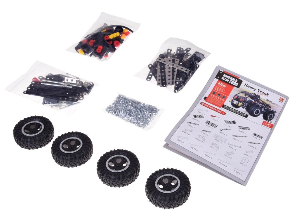 Tout le nécessaire dans une seule boîte : 475 pièces, pneus en caoutchouc, accessoires en plastique, vis et écrous, tournevis, clé et notice illustrée.