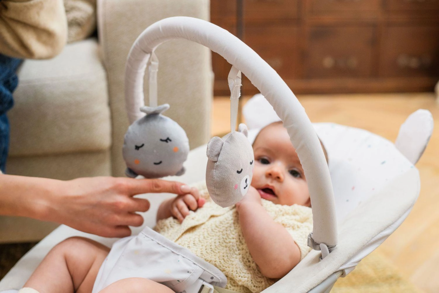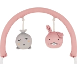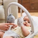 L’arche amovible avec deux jouets souples stimule le suivi visuel, la coordination œil-main et les premières préhensions.