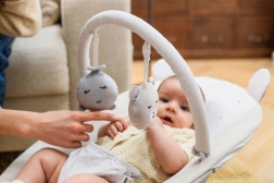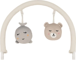 Une arche amovible avec deux jouets souples stimule la vue, le toucher et la coordination main-œil.