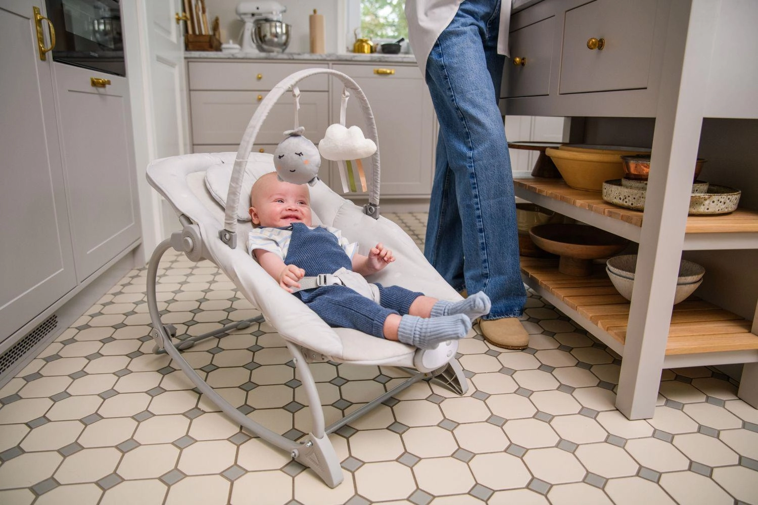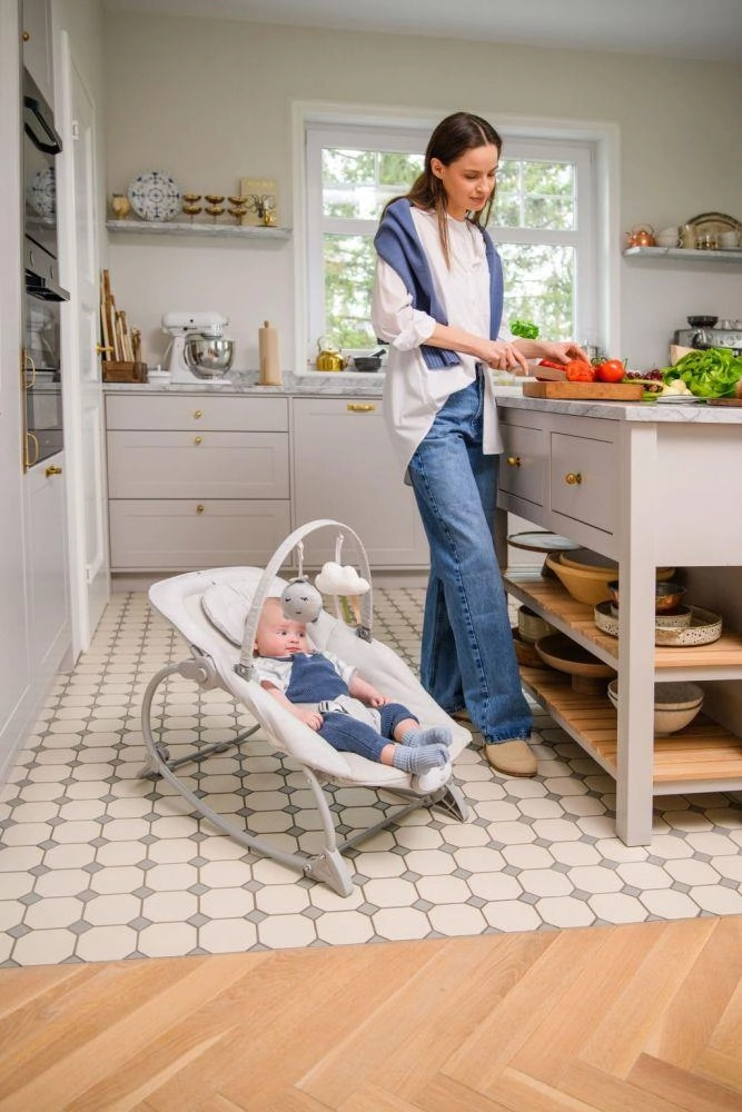 Le harnais de sécurité 3 points, le coussin doux amovible et l’arche avec deux jouets assurent sécurité et stimulation sensorielle.