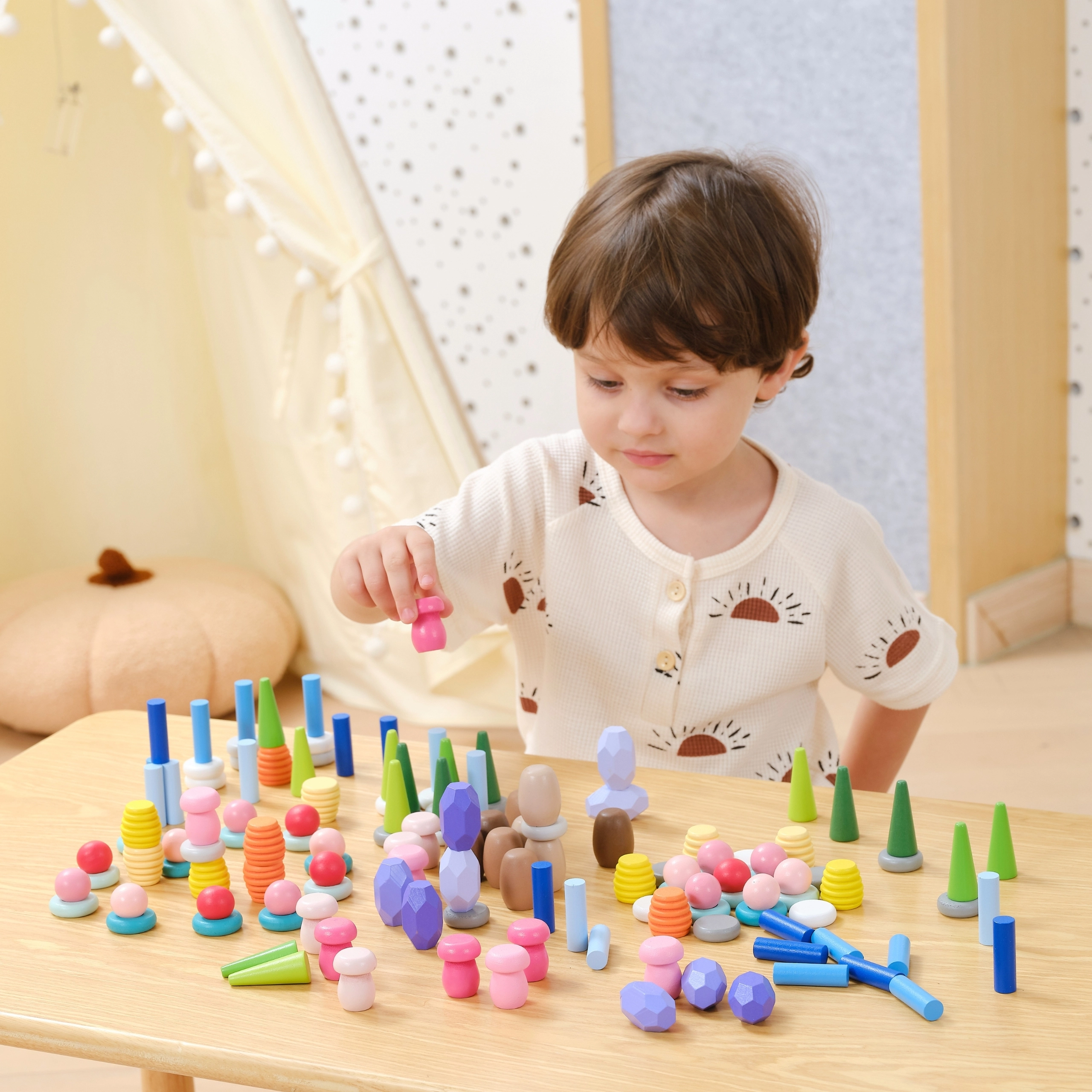 Les formes en bois lisses, anneaux, cônes et “galets” invitent à saisir, enfiler et équilibrer, favorisant la précision des gestes et la coordination œil-main.