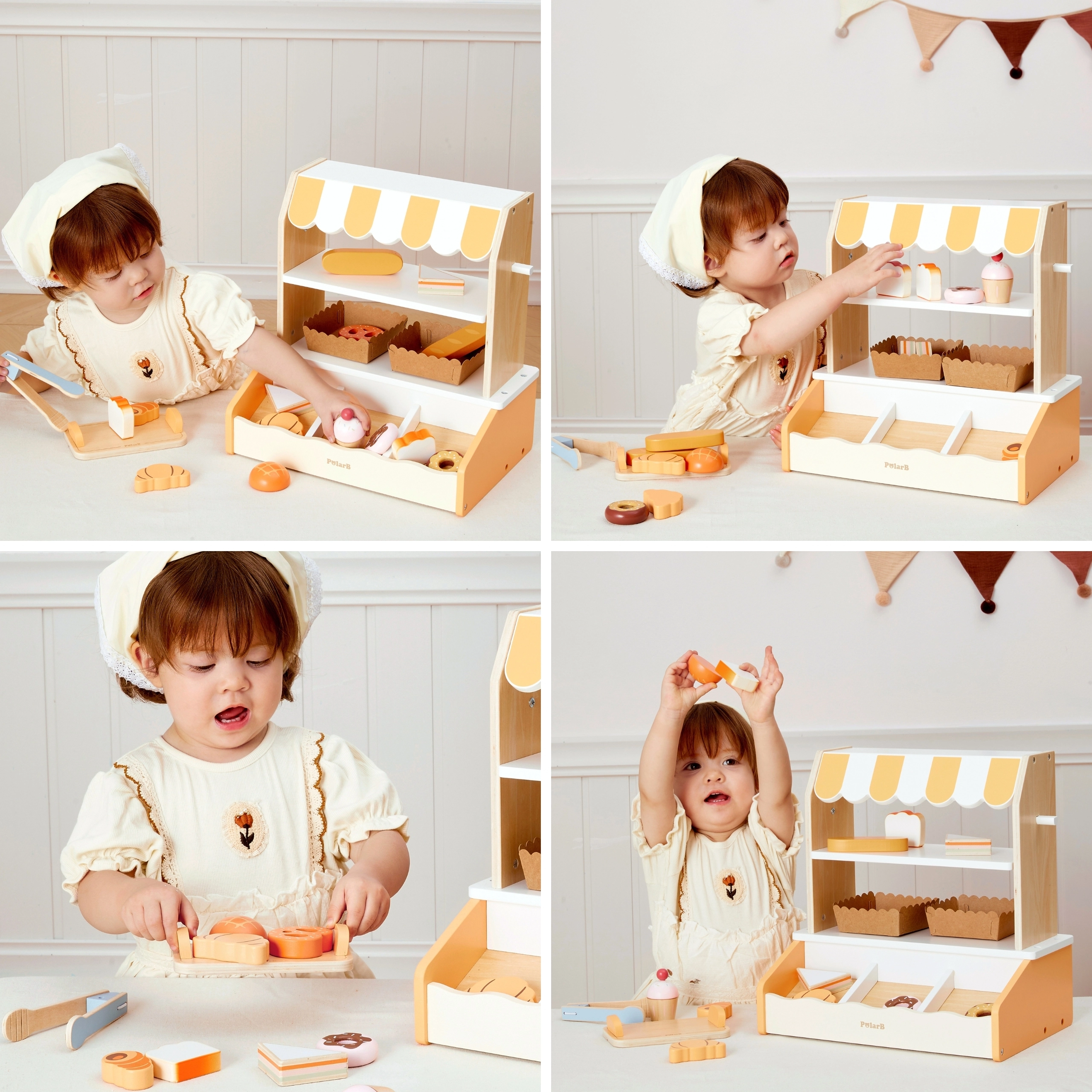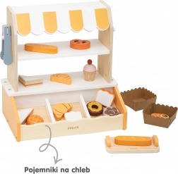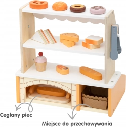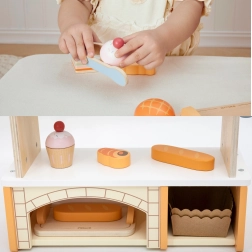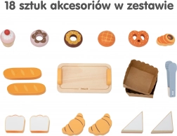 L’ensemble comprend une riche sélection de pains et d’ustensiles : plateau, pince, paniers en papier et différents types de gourmandises en bois (petits croissants, donuts, baguettes, toasts, bretzel, muffins, etc.). Le jeu développe naturellement la motricité fine, la coordination œil–main, la communication et la confiance en soi lors du service des « clients ».