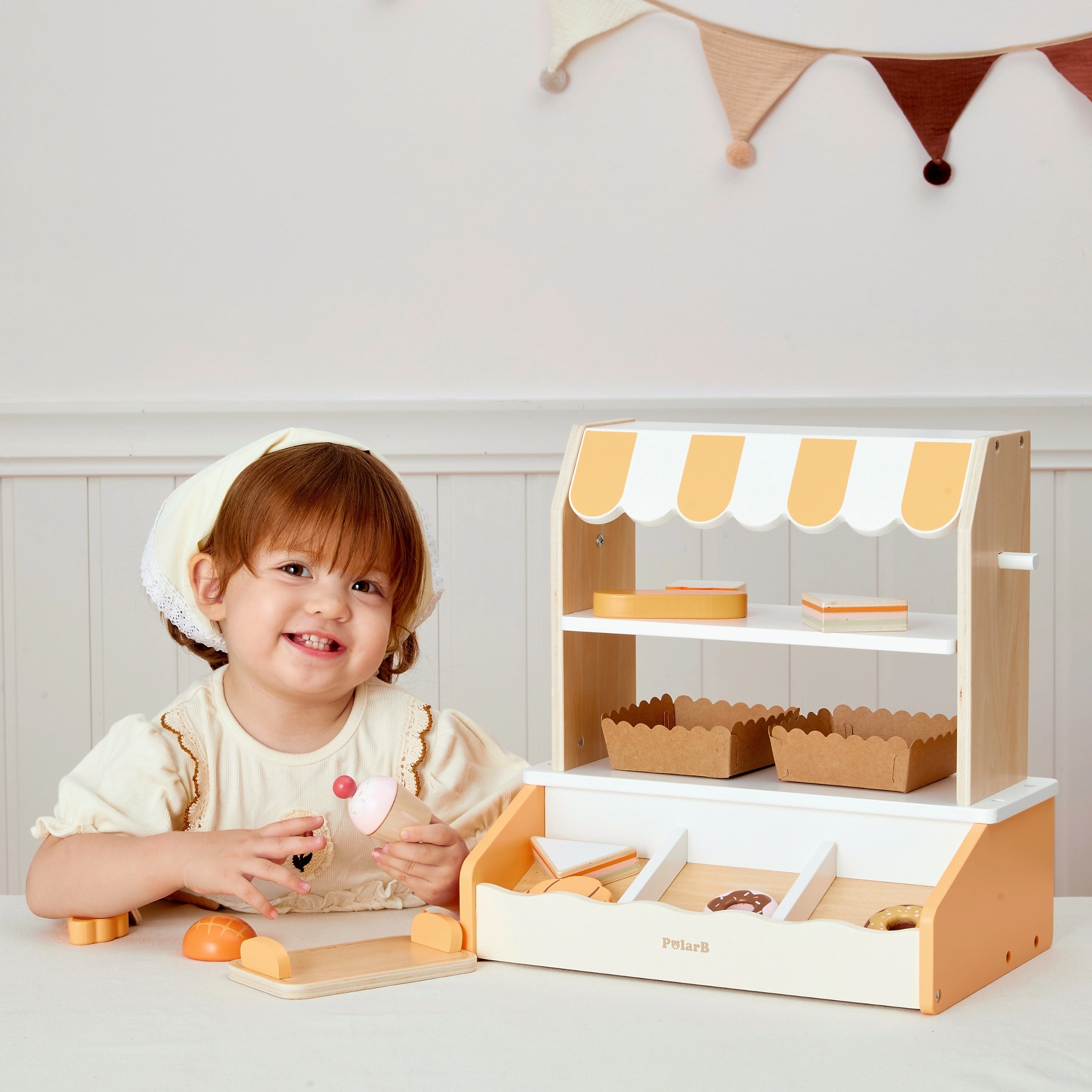 Cette mini boulangerie en bois au style soigné offre aux enfants un jeu de boutique réaliste – avec deux étagères d’exposition, des compartiments pour le pain et de petites gourmandises pour trier et servir. Grâce à ses dimensions compactes et à ses teintes pastel douces, elle s’intègre parfaitement dans toute chambre d’enfant.
