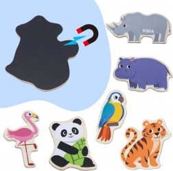 • 20 aimants en bois avec motifs : girafe, rhinocéros, éléphant, kangourou, lion, tigre, panda, autruche, flamant rose, singe, zèbre, chameau, crocodile, serpent, tortue, raton laveur, ours, ara et autres.
