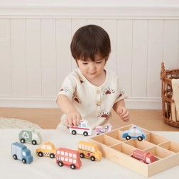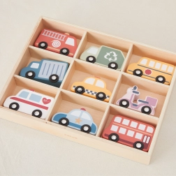 Grâce à l’organiseur en bois à compartiments, le rangement est rapide et ordonné – les enfants peuvent en même temps trier et apprendre à distinguer les types de véhicules. L’ensemble favorise le jeu de rôle, le développement des compétences de communication et la compréhension du travail des services municipaux.