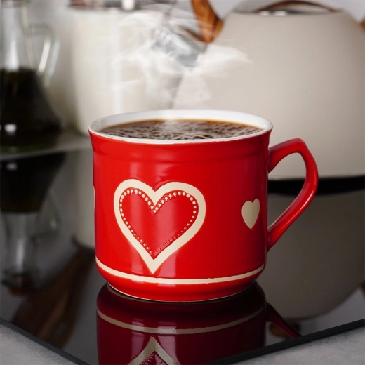 Cette tasse spacieuse en céramique de qualité allie praticité et charme. La finition rouge ornée de petits cœurs se démarque dans toute cuisine et, grâce à sa capacité de 650 ml, elle est idéale pour de grandes portions de thé, café, cacao ou boissons chaudes.