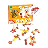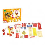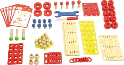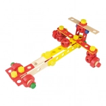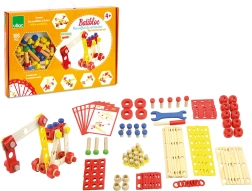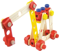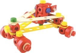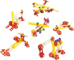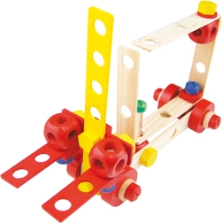 Des lattes colorées et naturelles, des vis, des écrous, des roues et des connecteurs permettent aux enfants d’assembler des véhicules et des constructions imaginaires et de les reconstruire à l’infini.