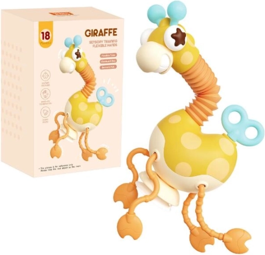 Cette girafe sensorielle offre à la fois amusement et apprentissage : tirez et repoussez son cou, observez les variations de longueur et entraînez la dextérité. Le jouet est conçu pour les petites mains et soutient le développement naturel des sens par le toucher et le mouvement.