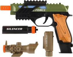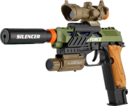 Pistolet en plastique au look réaliste pour les petits passionnés de jeux d’action. Il offre des effets lumineux, des effets sonores et des accessoires pratiques comme une lunette de visée, une lampe et un silencieux. Fonctionne avec des piles incluses dans l’emballage.