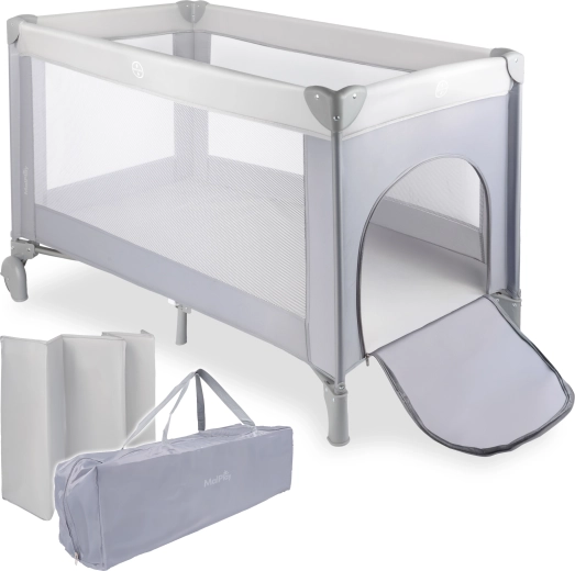 La structure légère avec deux roulettes facilite le déplacement à la maison comme en voyage. Trois parois en maille assurent une excellente circulation de l’air et une surveillance aisée de l’enfant, tandis que la porte latérale d’entrée/sortie est pratique pour le jeu. Sont inclus un matelas de 60 × 120 cm et un sac de transport pratique.