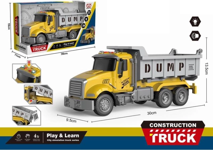 Une benne réaliste pour les petits bâtisseurs avec effets lumineux et sonores, mouvement fluide grâce au moteur à friction et conception robuste. Jouet idéal pour les enfants à partir de 3 ans, piles incluses pour un plaisir immédiat.