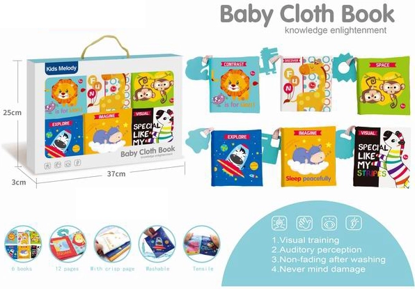 Découvrez de doux livres en tissu pour bébés dès 6 mois, qui favorisent le développement sensoriel et les premiers apprentissages. Chaque livre comprend 12 pages colorées avec des animaux et de simples légendes en anglais, une boucle de suspension avec anneau de dentition pratique, et est idéal à la maison comme en voyage.