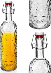 Élégante bouteille en verre au style rétro, d’une capacité de 1,1 l, avec fermeture à clip et joint en silicone pour une étanchéité parfaite. Idéale comme carafe pour limonade, vin ou sirops maison. Le verre épais de qualité avec relief décoratif met joliment en valeur le contenu et décore la table.