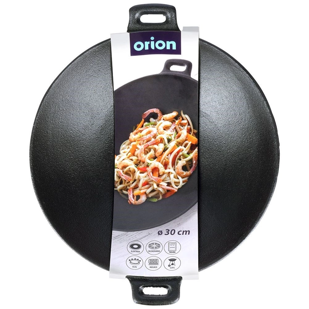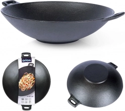 Wok universel en fonte de 30 cm de diamètre avec deux poignées, idéal pour la cuisson sauté rapide, la saisie à feu vif et la cuisson au four. La structure massive en fonte accumule et répartit la chaleur de manière uniforme, garantissant un résultat croustillant et juteux. Compatible avec gaz, électricité, vitrocéramique, halogène et induction.