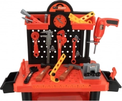 La perceuse jouet réaliste à piles, différents types de clés, un tournevis avec embouts, une équerre, une scie et un pied à coulisse permettent aux enfants d’essayer diverses activités – du vissage et du serrage à la mesure et au « sciage ». La conception en plastique sûre est idéale pour les enfants dès 3 ans.