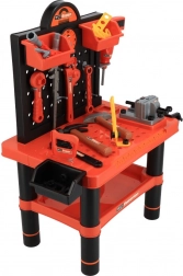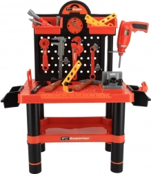 Le plateau de travail avec trous pour vis, emplacement pour étau et règle marquée favorise un jeu réaliste et le développement de la motricité fine.