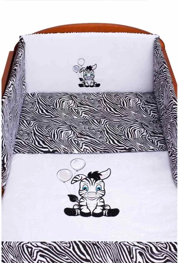 Ensemble stylé pour lit bébé avec motif zèbre et rayures contrastées. Comprend une housse de couette 100 × 135 cm, un oreiller 40 × 60 cm et un tour de lit 180 cm. Fabriqué en coton 100 % doux pour la peau sensible des enfants, avec fermetures éclair sûres et garnissages anti-allergiques.