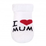 Ces chaussettes bébé blanches en éponge allient finition de qualité, confort et design craquant avec motifs I ♥ MUM / I ♥ DAD. La matière éponge douce et chaude respecte les peaux sensibles et garde les petits pieds au chaud même par temps frais.