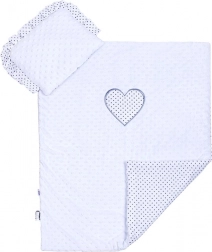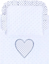 Cet ensemble réversible tout doux pour landau de la marque New Baby combine un minky moelleux et un coton respirant à pois. Il comprend un petit coussin à volant et une couette avec application en forme de cœur. Le garnissage en fibre anti-allergique assure un sommeil sécurisé et confortable pour bébé.