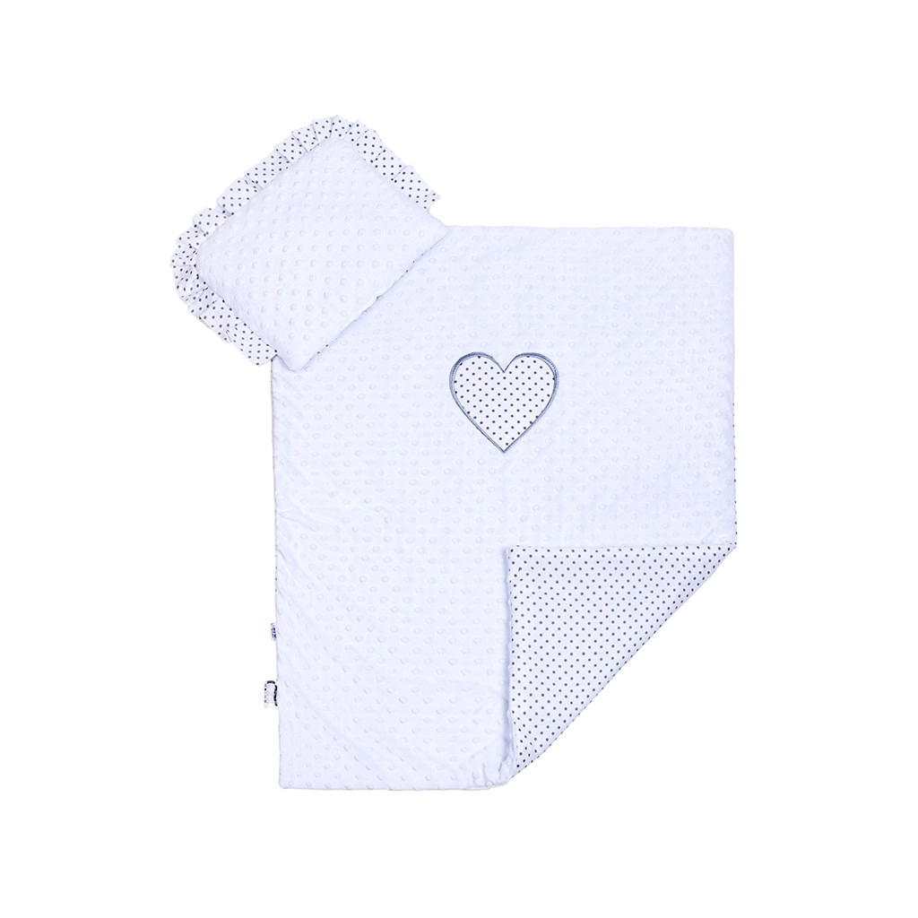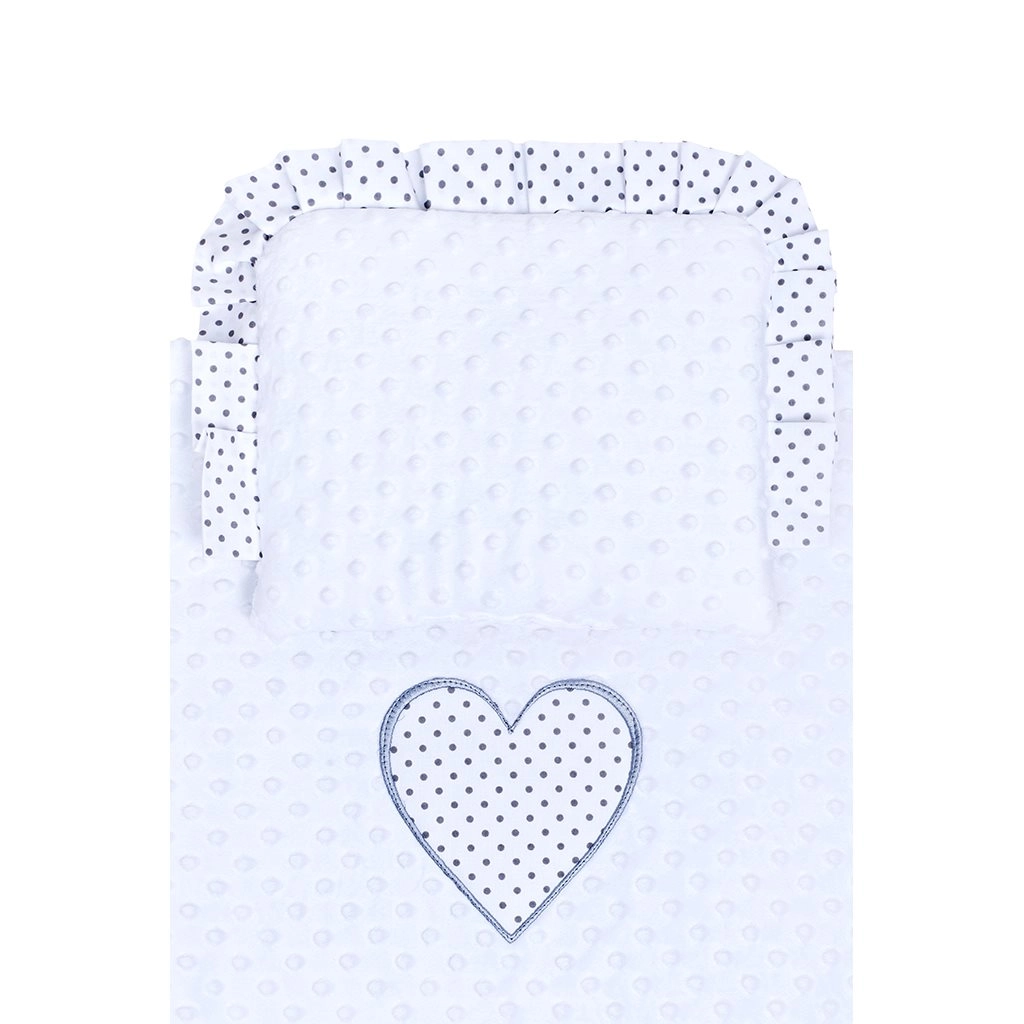 Élégant ensemble blanc de couettes pour landau en minky et coton, conçu pour la peau délicate des tout-petits. La surface minky à pois en relief réchauffe et caresse, tandis que la face en coton à imprimé pois intégral est agréable et respirante. La couette est décorée d’un grand cœur à pois, et le coussin est souligné d’un volant – un bel ensemble pour harmoniser tout landau ou petit lit.