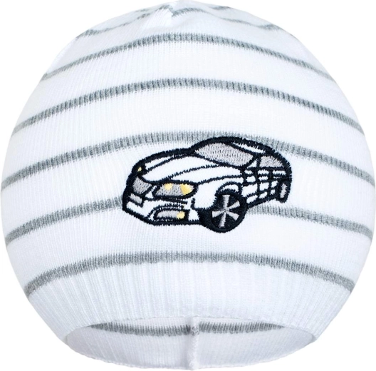 Bonnet pour enfant New Baby en maille agréable, avec motif de petite voiture et rayures colorées. Grâce au matériau respirant et élastique, il est idéal pour les journées de printemps et d’automne. Confectionné en 100 % coton pour un confort maximal, tour de tête env. 42–46 cm.