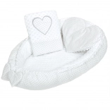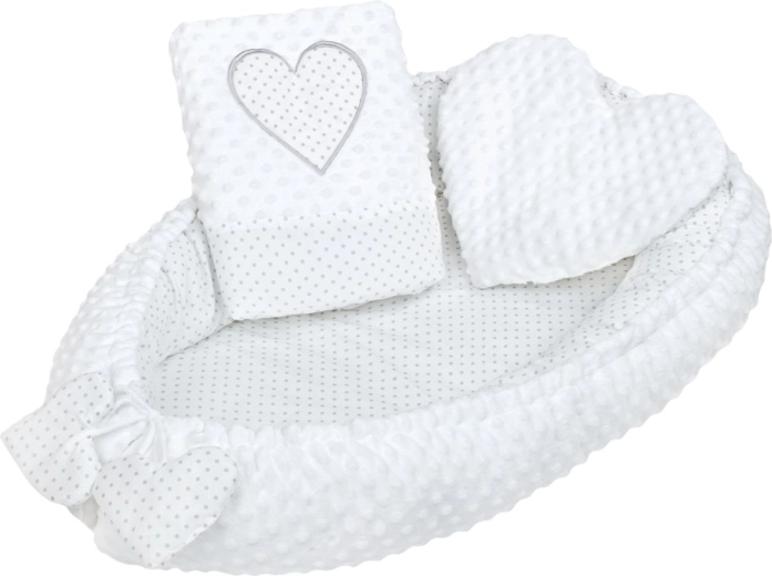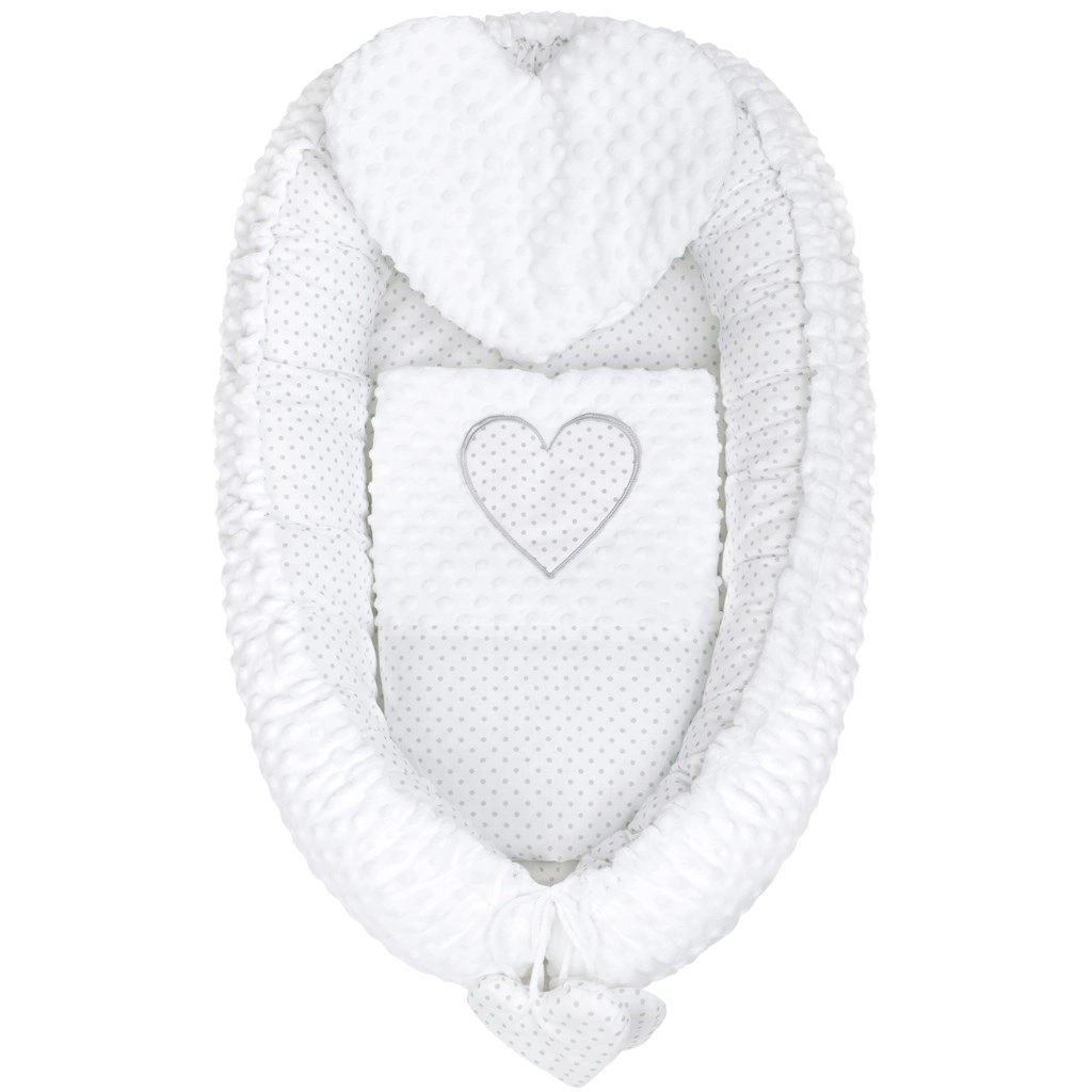 Nid confortable et sûr pour bébé NEW BABY avec motif cœur, offrant une minky douce, une conception réversible en minky et coton 100 % et un cordon réglable pour un ajustement idéal. Inclus un petit coussin en forme de cœur et une couette pour un maximum de confort et de chaleur.