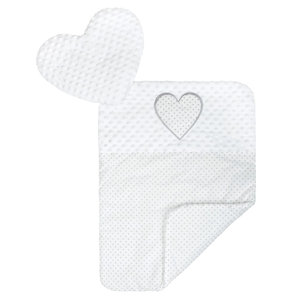 Comprend un petit coussin en forme de cœur et une couette pour une douce chaleur et un soutien de la tête. Design assorti en blanc avec de délicats pois.