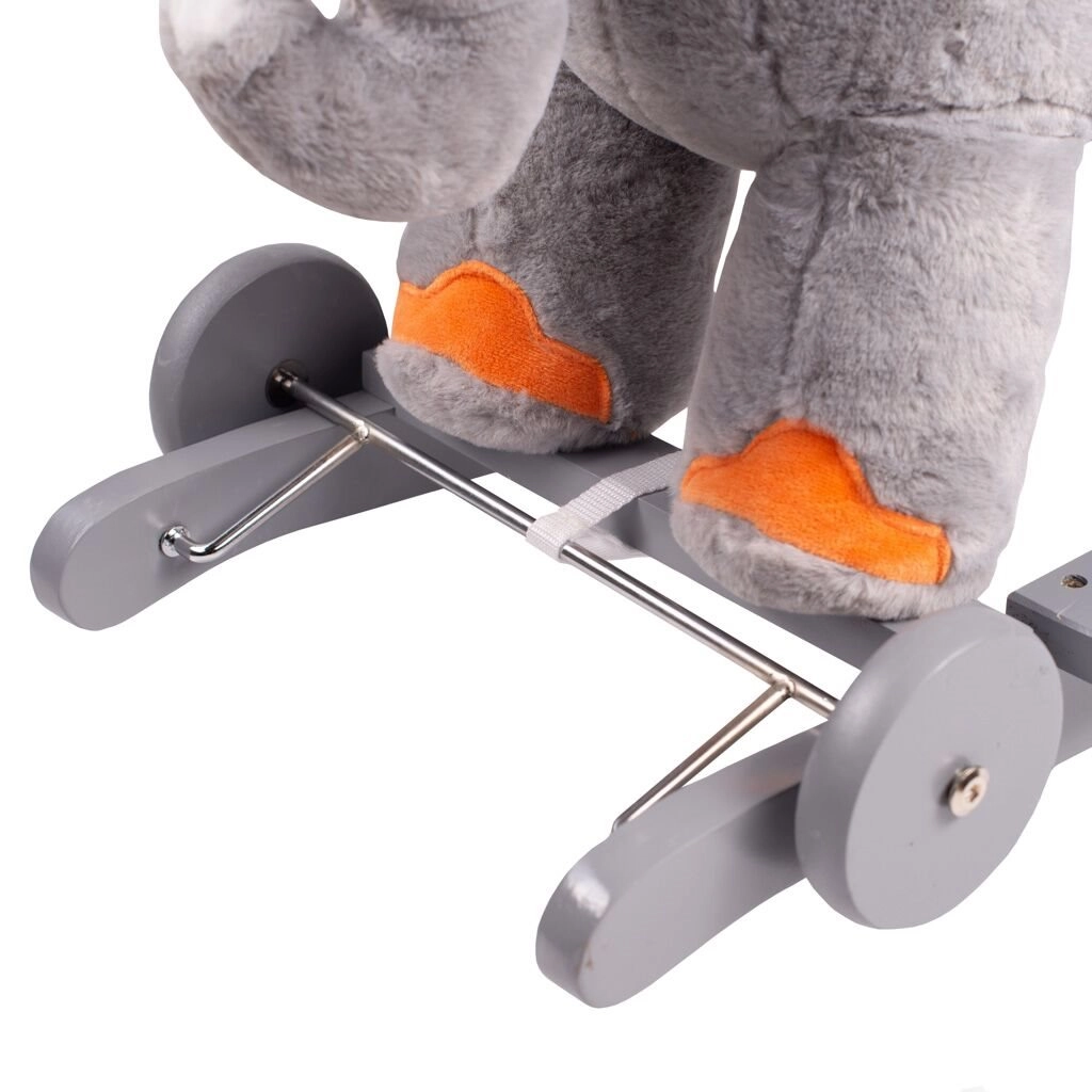 Adorable éléphant en peluche 2-en-1 de la marque PLAYTO, à la fois jouet à bascule et porteur. Grâce au mécanisme simple de roues escamotables, vous passez facilement du mode bascule au mode roulettes. Oreille interactive avec mélodie, matière toute douce et siège confortable avec dossier garantissent un jeu en toute sécurité et favorisent la coordination des mouvements.