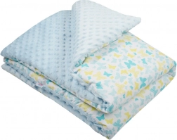 La douce couverture pour enfant NEW BABY combine un tissu minky à reliefs moelleux et du coton 100 % aux motifs ludiques. Elle est antiallergique, sans pièces en plastique ni en métal et convient parfaitement à la poussette, au lit bébé et au siège auto.
