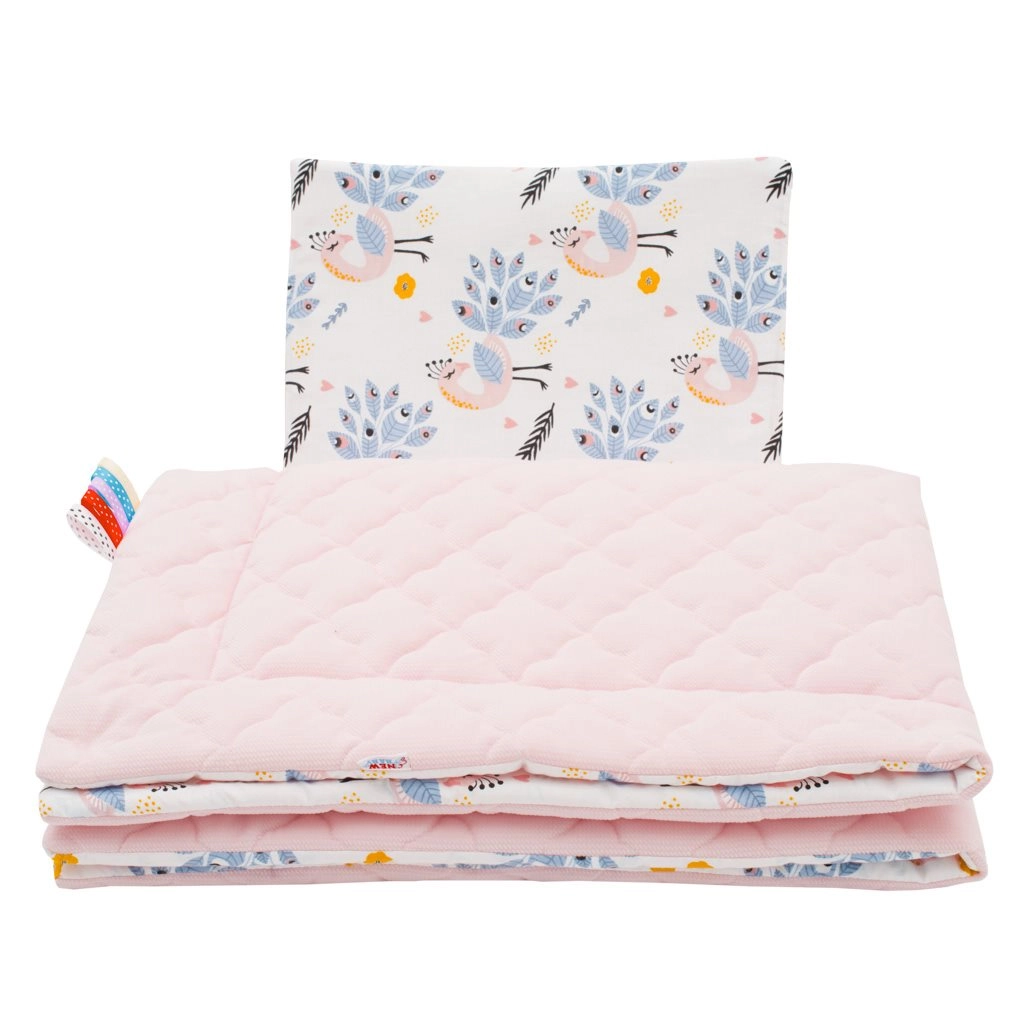 L’ensemble réversible en velours de la marque tchèque New Baby est un choix idéal pour le confort de bébé à la maison comme en déplacement. Une face en coton doux avec motif apaisant de paons, l’autre en velours ultra‑moelleux qui tient bien chaud et garde sa forme. Les rubans colorés sur la couverture attirent l’attention de bébé et stimulent son développement sensoriel.