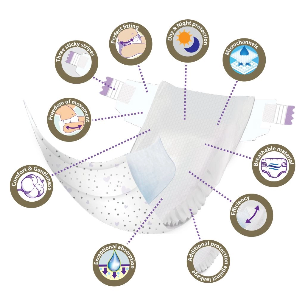 - Matériaux respirants, couche intérieure 3D ultra douce, fermeture scratch 3D, bords élastiques, volants doux anti‑fuites