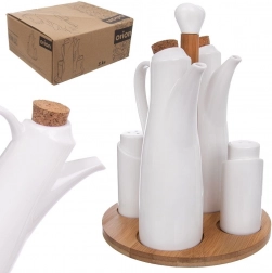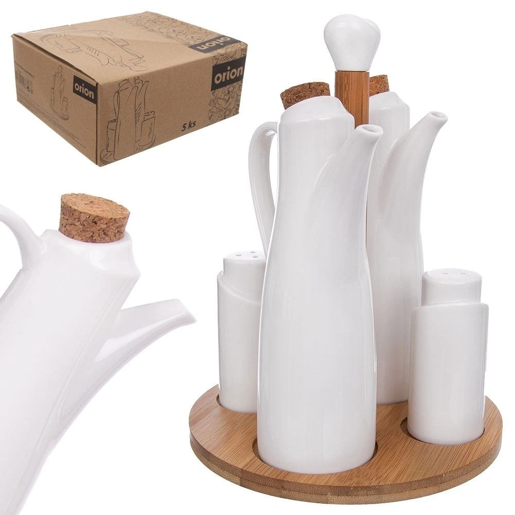 Ce set en porcelaine 5 pièces est idéal pour le quotidien comme pour les services de fête. Il associe un design blanc épuré au bambou naturel et apporte ordre et élégance à votre cuisine. Grâce aux bouchons en liège, vos huiles et vinaigres restent frais plus longtemps, et la porcelaine passe sans crainte au lave-vaisselle.