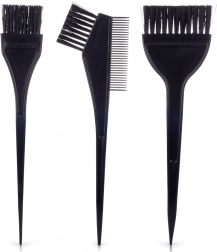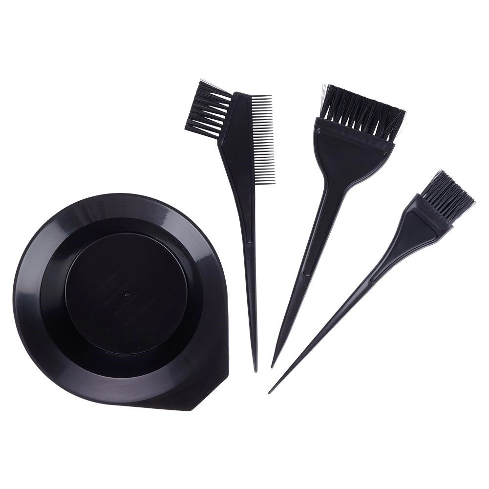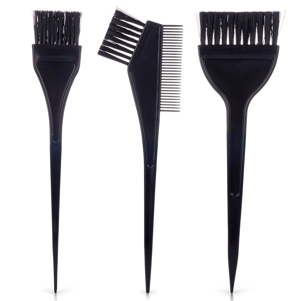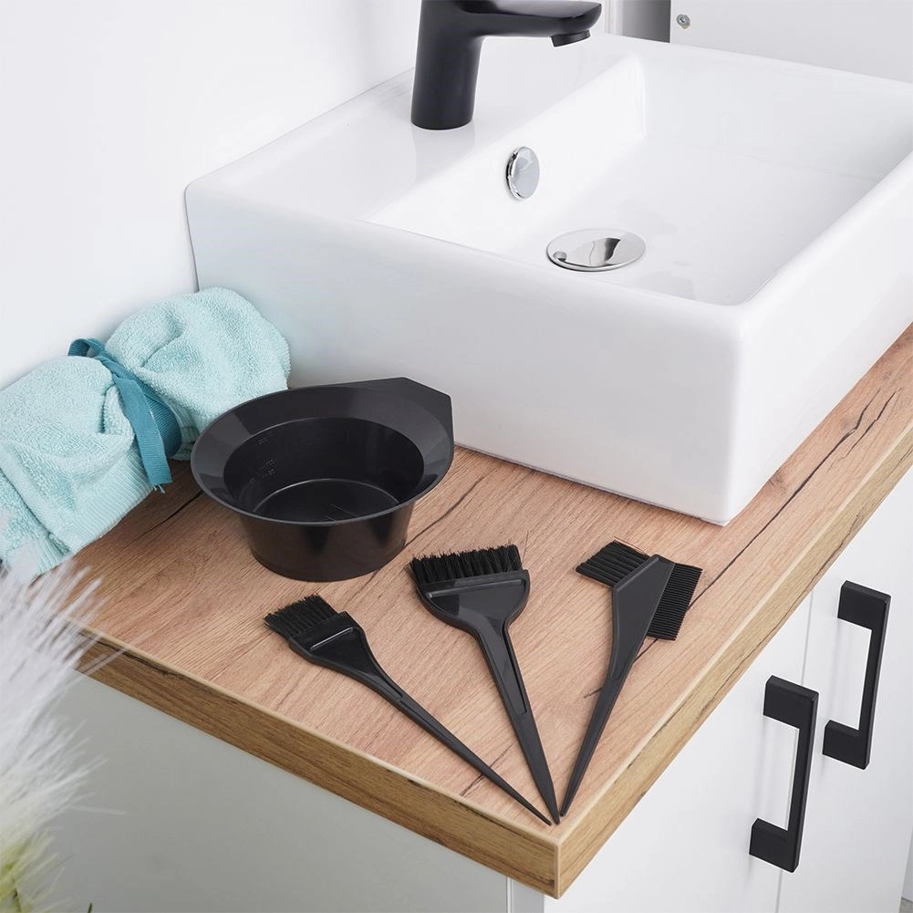 Kit complet de coloration des cheveux pour un usage domestique et professionnel : bol avec graduation et trois pinceaux d’application dont un pinceau avec peigne. Conception en plastique résistant aux produits chimiques, manches pointus pour séparer les mèches avec précision et réutilisation grâce au nettoyage facile.