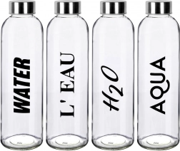 Bouteille élégante en verre de 700 ml avec bouchon métallique à vis et joint en silicone pour une étanchéité parfaite. Idéale pour l’eau, la limonade, les jus ou les smoothies. Verre transparent résistant avec une inscription noire élégante et un design intemporel pour une hydratation au quotidien à la maison, au travail et en déplacement.