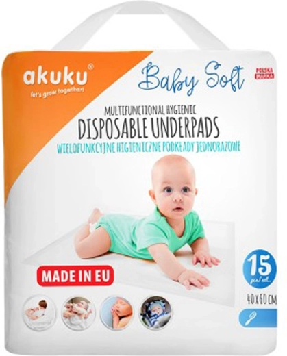 Pratiques, les alèses jetables AKUKU Baby Soft protègent efficacement matelas, tables à langer et lits contre l’humidité et les salissures. Grâce à leur douce couche supérieure en cellulose, elles sont agréables pour la peau de bébé, tandis que le film imperméable au dos empêche toute infiltration. Le paquet contient 15 pièces de 40 × 60 cm avec une structure à 8 couches pour une protection maximale.