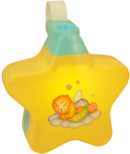 L’utilisation est intuitive – des boutons séparés permettent d’activer la musique et la projection séparément ou ensemble, tandis que 2 niveaux de volume adaptent le son aux besoins de bébé. Une poignée pratique et une sangle de fixation en plastique assurent une installation facile sur le lit ou le berceau.